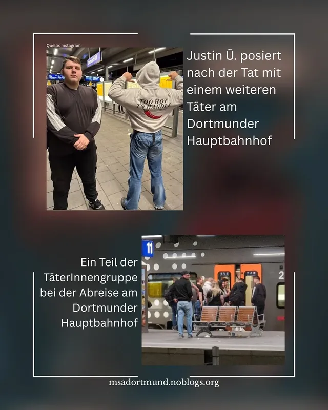 Ein weiterer Täter ist zudem Justin Ü. aus Essen. Ü. gehört zum Umfeld der Heimatjugend und ist Gründer der Social Media Kameradschaft „Deutsche Elite Jugend“. Ü. posierte nach der Tat mit weiteren Nazis stolz am Dortmunder Hauptbahnhof für Fotos.