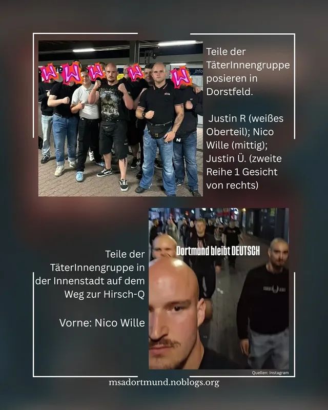 Wie sicher sich die Gruppe bei ihrem feigen Angriff gefühlt hat, zeigt sich dabei auf verschiedensten Social-Media-Kanälen, wo TäterInnen zum Teil den Weg von Dorstfeld bis zur Kneipe dokumentierten und auch im Nachgang Poserfotos am Hauptbahnhof anfertigten. Einer der Haupttäter scheint dabei erneut Nico Wille zu sein. Der in Eving wohnende Gewalttäter ist Mitglied der neueren Kameradschaft „Der Störtrupp“ und sucht dabei auch immer wieder Kontakt zu den Mitgliedern „Der Heimat“ und rechten Szenemusikern wie Marko Gottschalk. Wille versucht, sich in der Szene vor allem durch seinen Hang zur Gewalt zu profilieren und sich einen Namen zu machen.