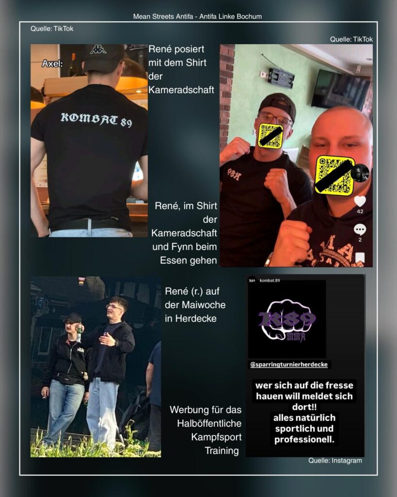 Eine weitere zentrale Person der Kameradschaft ist der 19 Jährige René G., der in Herdecke, ebenfalls bei seinen Eltern, wohnt. Dieser scheint im Umkreis Herdecke/Hagen einen großen Bekanntenkreis zu haben und organisiert mutmaßlich die halböffentlichen Kampfsportaktivitäten der Gruppe. Er ist Betreiber der Seite “SparringHerdecke”, die lange Zeit ebenfalls das Logo der Gruppe als Profilbild trug und sich als Amateur-Trainingsgruppe für Interessierte inszeniert. Es ist davon auszugehen, dass die Gruppe diese Aktivitäten nutzt, um neue Mitglieder zu rekrutieren. Selbst macht René G. viel Kraftsport und er nahm auch an gemeinsamen Wanderungen der Kameradschaft teil. Auch die private Gartenlaube seiner Eltern dient der Gruppe und deren Umfeld oft als Treffpunkt, um sich zu betrinken und von dort aus dann weiterzuziehen.