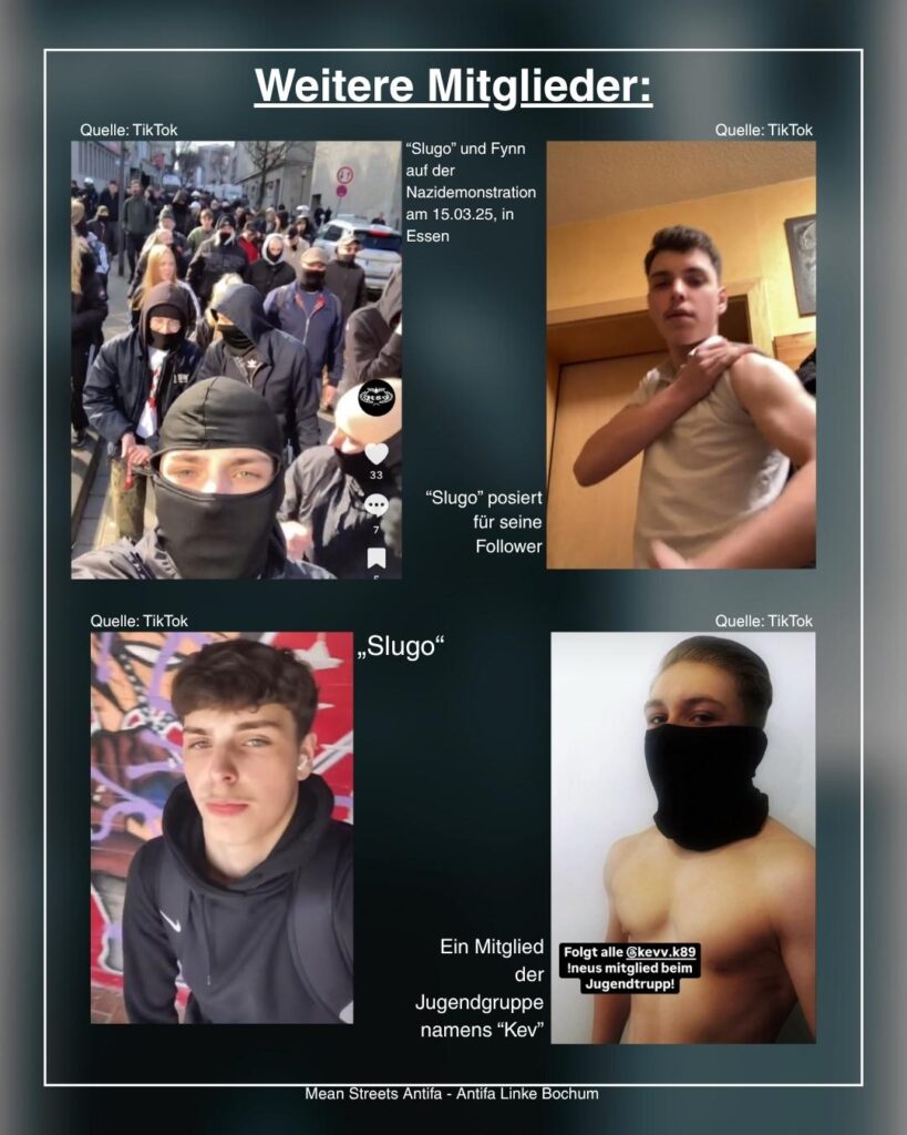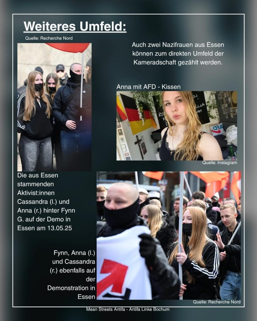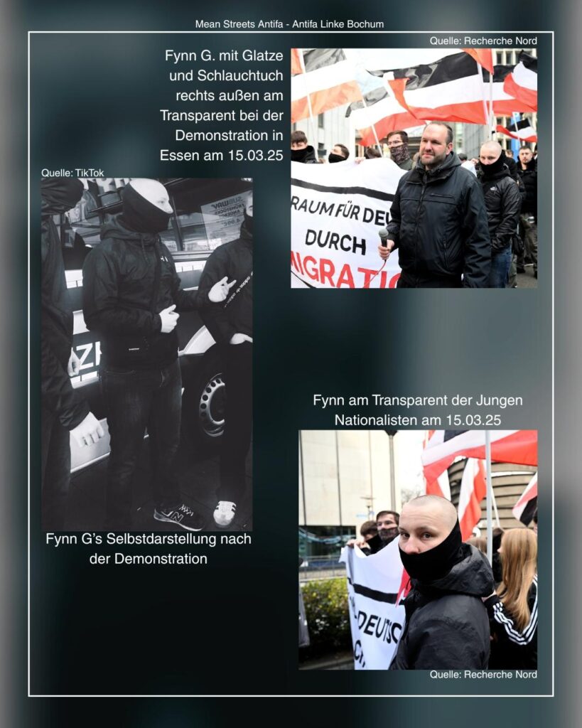 Fynn G. besitzt darüber hinaus auch Vernetzungen in die Naziszene des Ruhrgebiets. In seinen Freundeslisten finden sich Mitglieder von jüngeren Kameradschaften wie “Der Störtrupp” und “Jung & Stark”, aber auch Personen aus dem rechtsterroristischen Milieu, wie beispielsweise das Schweizer “Blood & Honour”-Mitglied Manuel Bertozzi. Er nahm auch an der Demonstration am 15.03.25 in Essen teil, die von der Kameradschaft “Neue deutsche Jugend” zusammen mit erfahrenen Neonazis aus Dortmund-Dorstfeld organisiert wurde. Er trug mit anderen K89 Mitgliedern ein Banner der “Jungen Nationalisten”, was eine besondere Aufgabe in der rechten Szene darstellt.