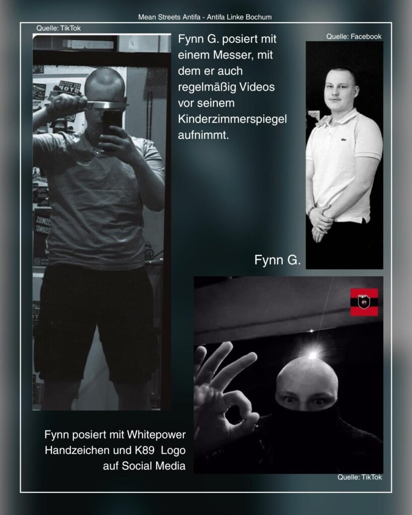 Fynn G. inszeniert sich online als Kopf der Gruppe, verantwortlich für die Videos und Admin des Telegram Chats “Kombat89”, über den die Gruppe organisiert ist. Auch für seine eigenen Profile dreht er regelmäßig Reels und andere kurze Videos, oft – wie es für eine trendrechte Kameradschaft gehört – vor seiner, mit Fußball- und Naziaufklebern beklebten, Kinderzimmertür. Dort entstanden auch Videos, wo er den bewaffneten Kampf mit dem Messer trainiert.